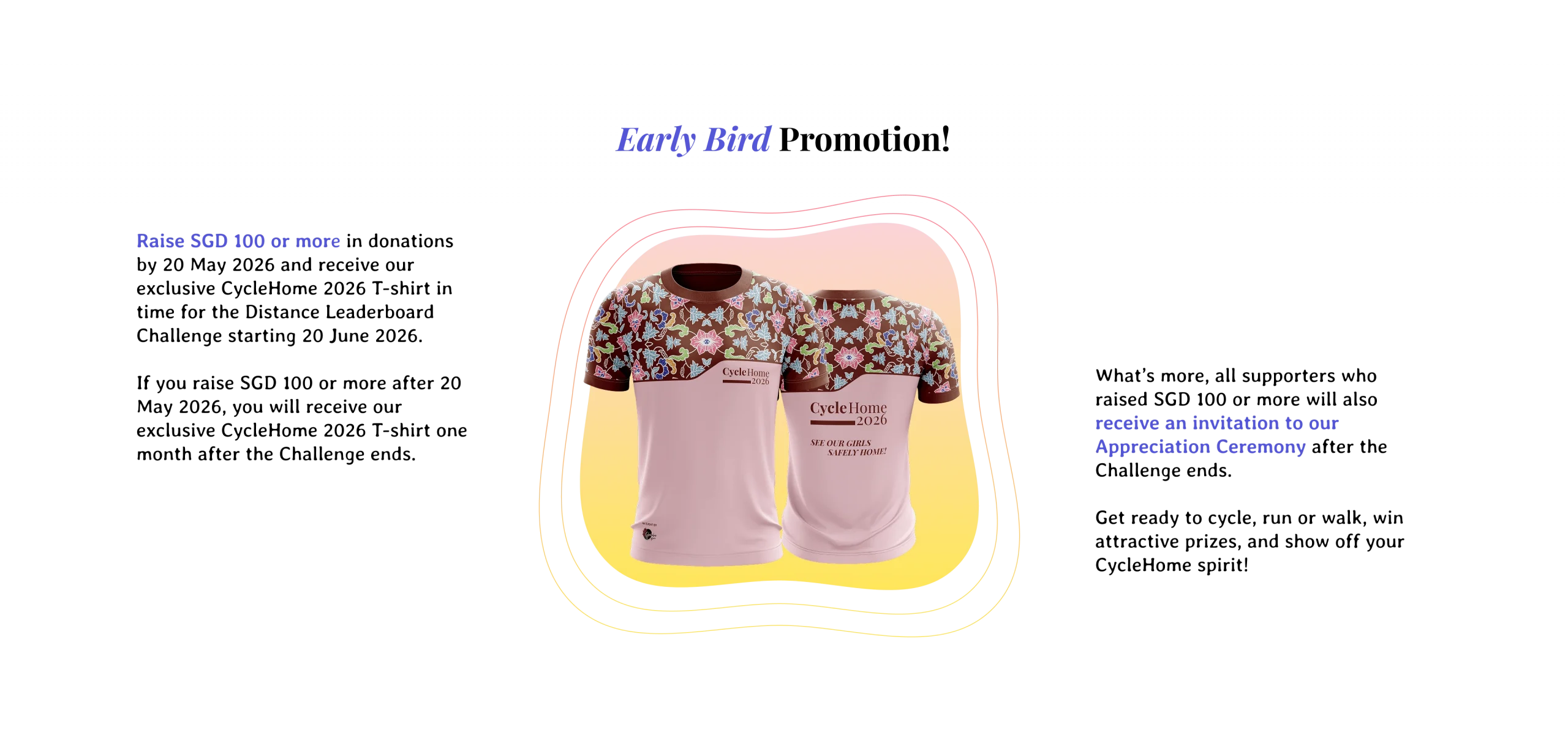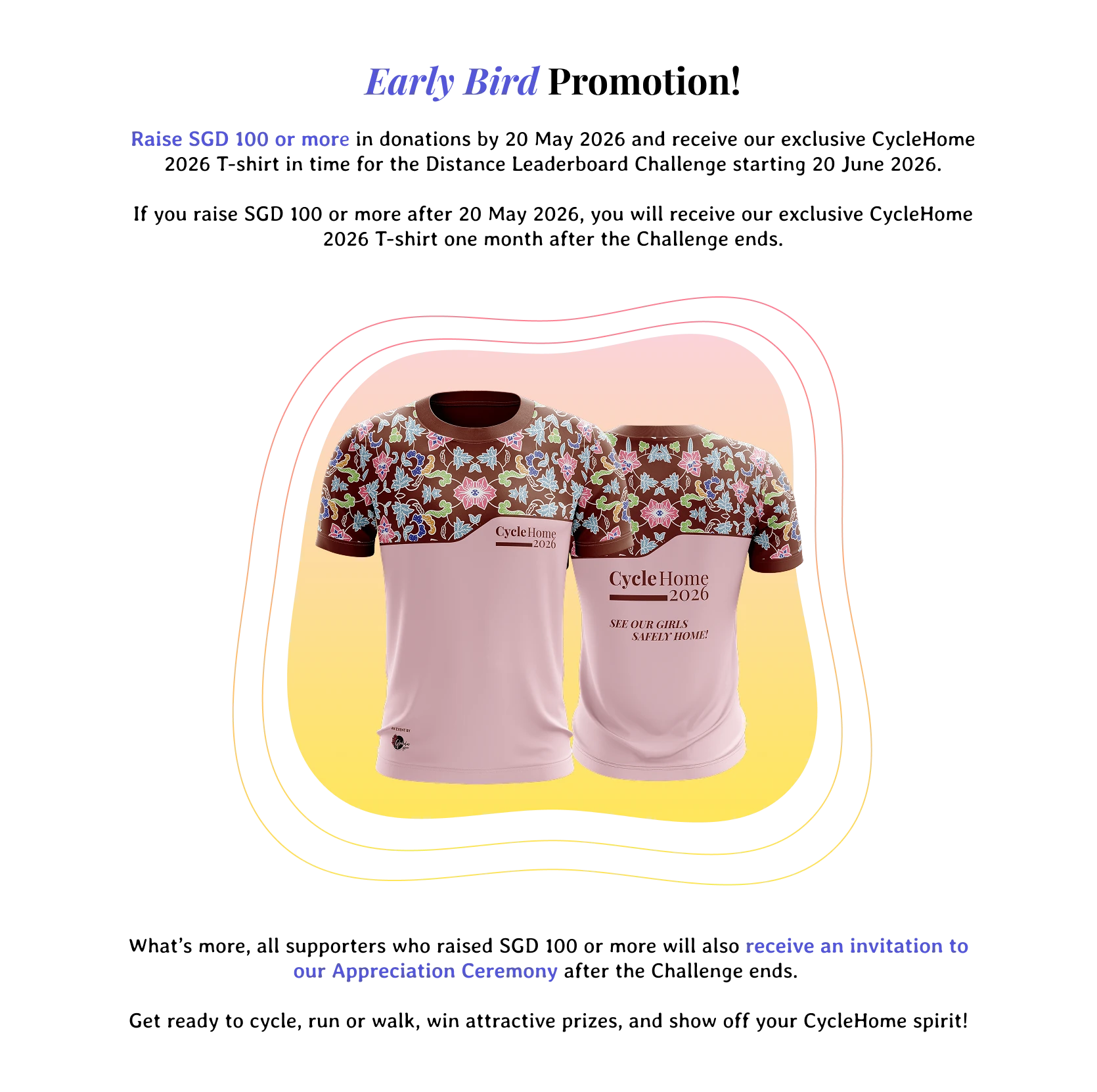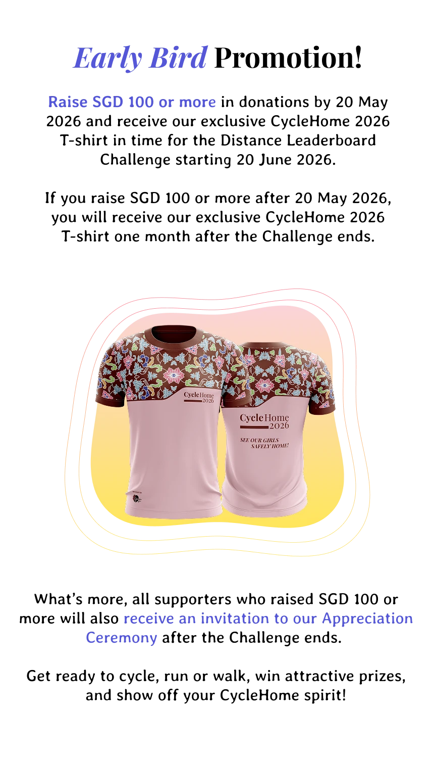 Raise SGD 100 or more in donations by 21 July 2025 to receive our CycleHome 2025 T-shirt. You will receive it one month after the Challenge ends.